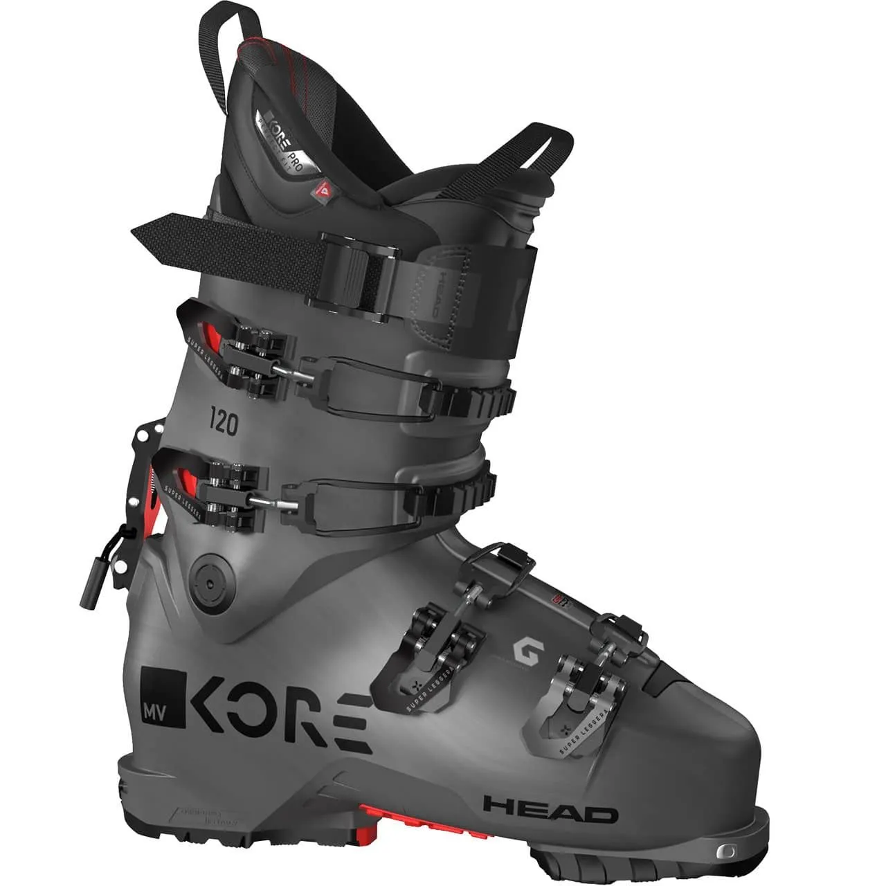 De nieuwe constructie met 100 mm leest en de volledig nieuwe Innenschuh zijn gebaseerd op de Formula serie. Het herziene ski-/wandelmechanisme zorgt voor vrije mobiliteit en een stabiele verbinding tussen Schale en manchet. HEAD’s LYT TECH constructie zorgt ervoor dat overtollig gewicht wordt bespaard zonder de prestaties te verminderen. Een 53 mm Powerstrap en de Supperleggera gespen zorgen voor een stevige grip in de schoen, de Dynafit Tech Inserts en de GripWalk zolen maken de KORE 120 GW klaar voor backcountry gebruik.